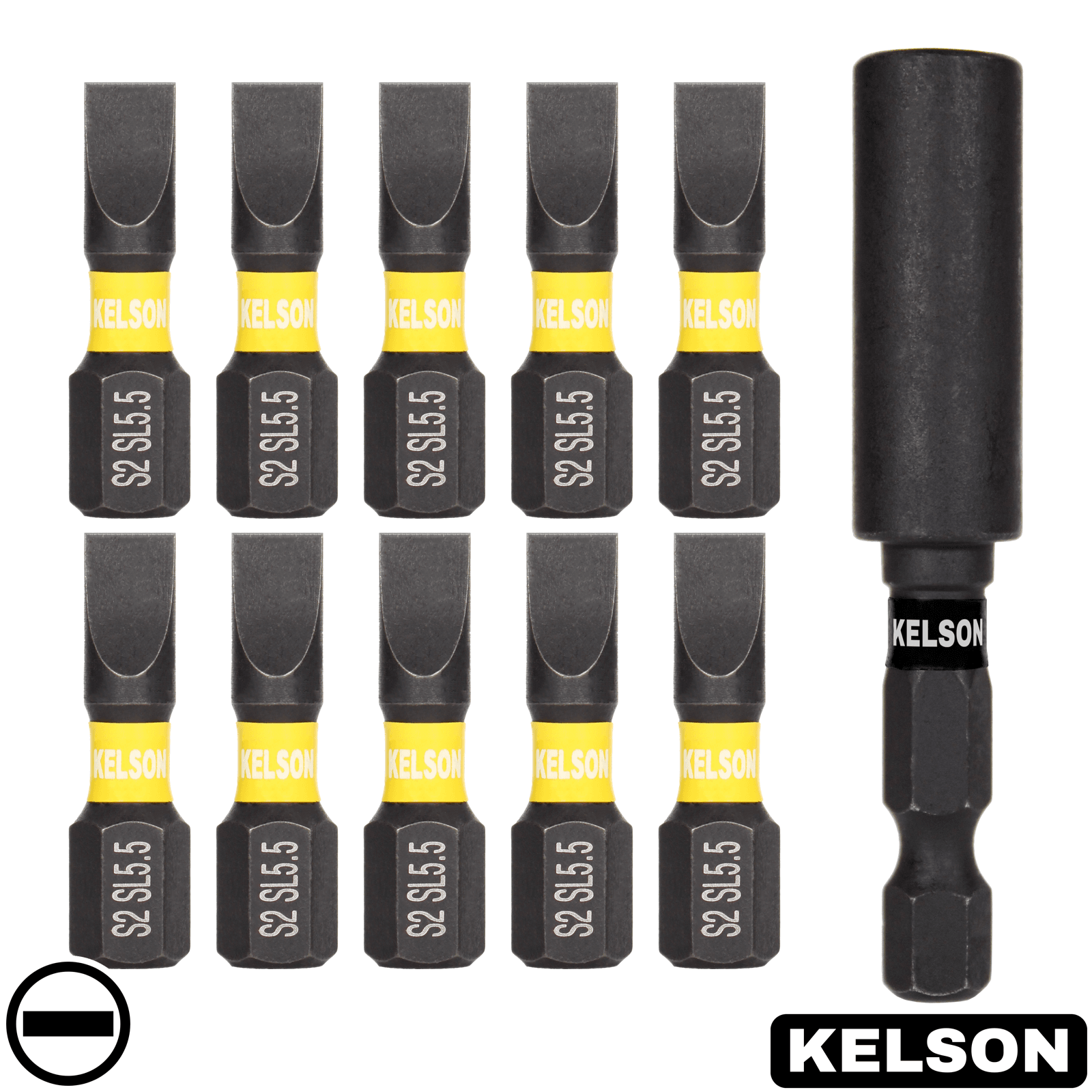 10 x 5.5mm Slot Flat-Head 25mm Impact Screwdriver Bits With 60mm Magnetic Bit Holder